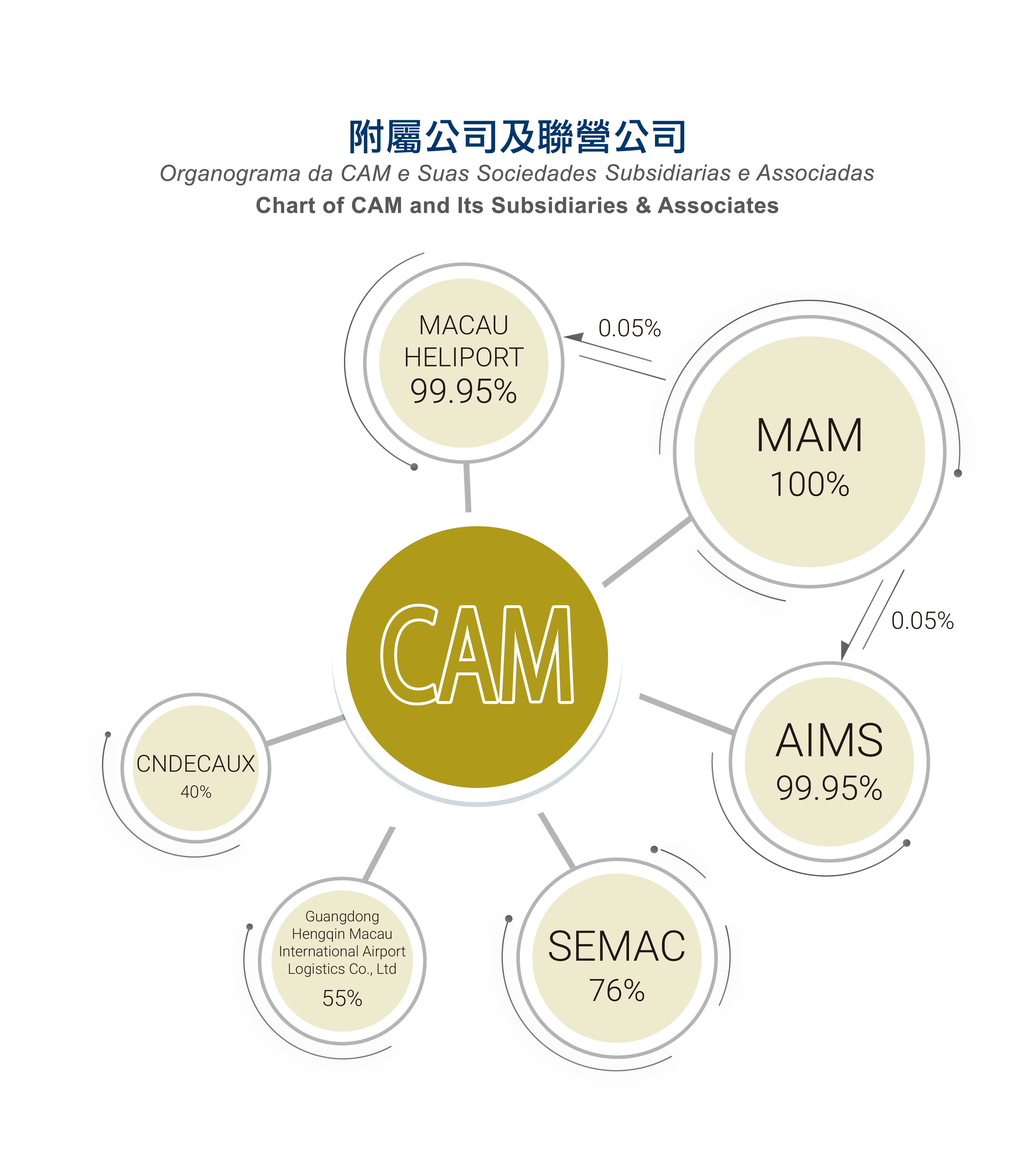 澳门国际机场专营股份有限公司(CAM)成立於1989年1月18日,同年3月8日获澳门政府授予25年的专营合约,作为机场的业权人,负责兴建及经营澳门国际机场,并於2001年3月获澳门特区政府延长经营权至2039年。本公司主要负责机场发展,财务安排,市场拓展和推广以及机场营运,同时以合约形式,将机场日常运作的主要环节委托多家专业公司管理,确保机场营运达到国际标准。