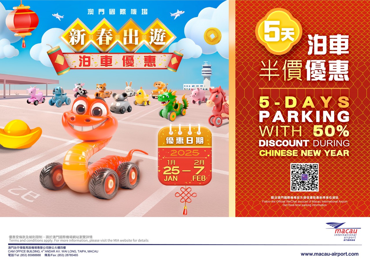 此外,澳门国际机场特别推出新年出游泊车优惠,与旅客欢庆农曆新年。由2025年1月25日起至2月7日,凡於澳门国际机场出游的旅客可享最多连续5日的泊车半价优惠,优惠适用於澳门国际机场南面及北面停车场。旅客无需提前预约登记,只需从机场出发并保留来回程的登机证,於取车前亲临机场停车缴费处出示其本人有效旅行证件及来回登机证,即可享受半价泊车优惠,否则优惠无效。车位数量有限,优惠先到先得,市民出门前可於澳门国际机场网站及微信官方帐号查询停车场实时车位余额,以便掌握行程。