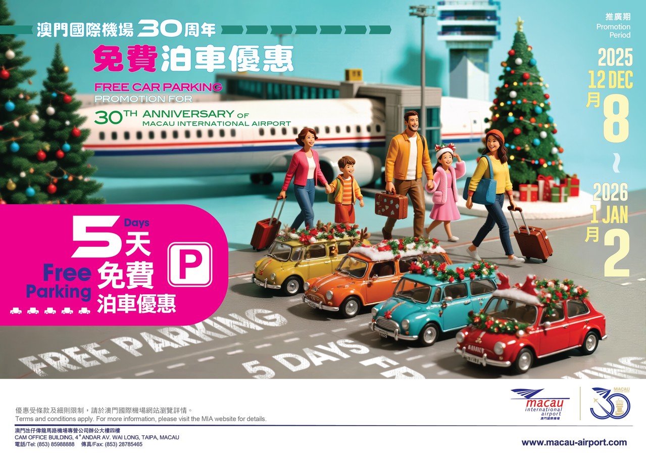 为庆祝澳门国际机场营运三十周年,澳门国际机场於冬季旅游旺季特别推出三十周年免费泊车优惠便利旅客出行。由2025年12月8日起至2026年1月2日,凡在澳门国际机场出游的旅客可享最多连续5日免费泊车优惠,优惠适用於澳门国际机场南面及北面停车场。旅客无需预约登记,只需从澳门国际机场出发及回程飞抵澳门国际机场,并在取车前亲临到达层缴费处出示本人之有效旅行证件及来回登机证,即可获得相关泊车优惠,否则优惠无效。车位数量有限,优惠先到先得,旅客出门前可於澳门国际机场网站及微信官方帐号查询停车场实时车位余额数量,以便掌握行程。