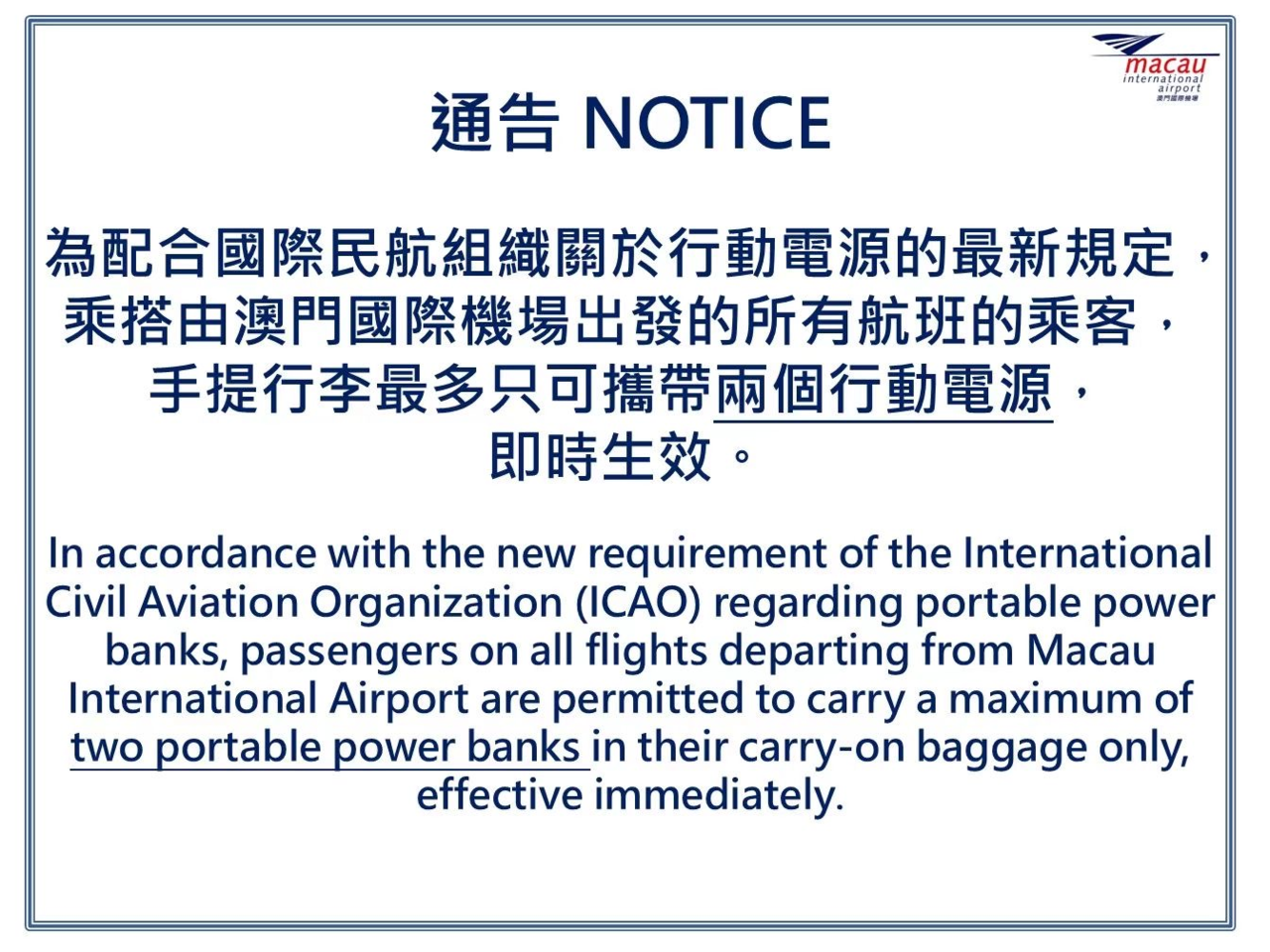 近日,国际民用航空组织(ICAO)发佈了关於客机携带充电宝的新规定,并於3月27日(週五)正式生效。澳门国际机场专营股份有限公司已第一时间协调各单位,全面配合执行新规定,全力保障航空安全与旅客顺畅出行。