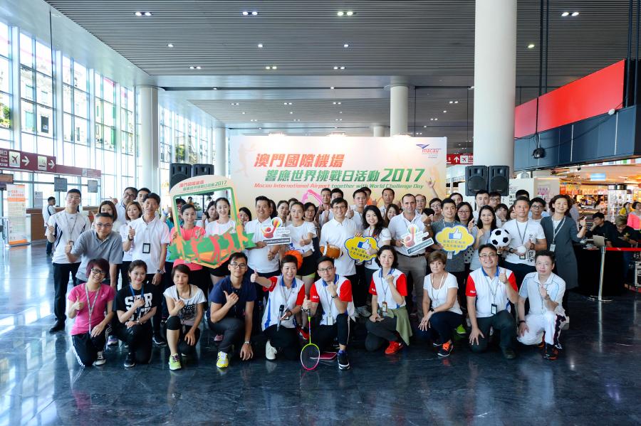 应澳门特别行政区体育局邀请,澳门国际机场专营股份有限公司于2017年5 月31 日上午召集机场员工连续第10年参与世界挑战日活动。参加单位包括:澳门国际机场专营股份有限公司(CAM)、澳门机场管理有限公司(ADA)、机场信息管理技术有限公司(AIMS)、澳门保安有限公司(SEMAC)、明捷澳门机场服务有限公司,其员工代表超过80人暂时放下工作,在体育局派出的专业舞蹈人员带领下,跟着音乐节拍,于机场客运大楼内运动15分钟,响应这项每年一度全城参与的体育盛会,使同事在伸展筋骨的同时,让更多旅客能够感受活动带来的活力。