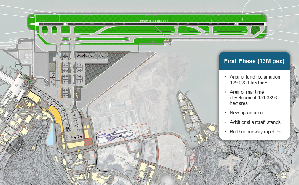 1. Land reclamation for the sea area between the artificial islands of the runway and the two existing taxiways with the purpose of increasing runway capacity to create additional aircraft stands and to build runway rapid exit;