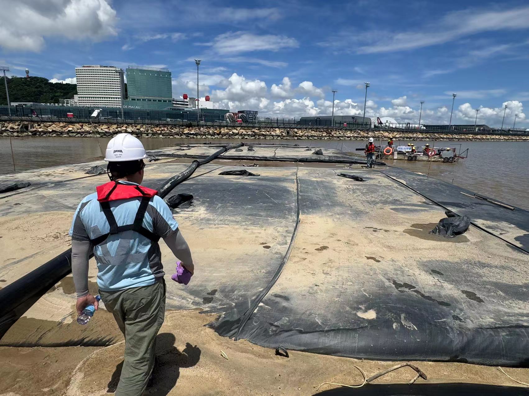 填海施工已相繼展開,包括臨時堤堰砂袋吹填、填海物料運輸皮帶機系統的搭建,並持續進行施工期的環境與防洪監測活動。