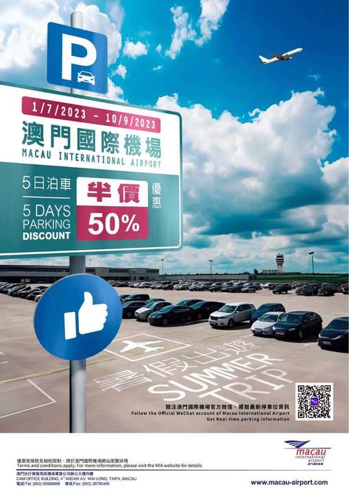 暑假出遊熱潮即將來臨,為迎接這個旅遊旺季,由2023年7月1至9月10日,凡於澳門國際機場出遊的旅客可享最多連續5日的半價泊車優惠,優惠適用於澳門國際機場南面及北面停車場。旅客無需預約登記,只需從澳門國際機場出發,及回程飛抵澳門國際機場,並保留來回程登機證以領取優惠;由於機場停車場已啟用車牌識別無感繳費服務,因此旅客回到澳門國際機場時須親臨到達層之繳費處出示本人之有效旅行證件及來回登機證,即可獲得半價泊車優惠,否則優惠無法生效。車位數量有限,優惠先到先得。