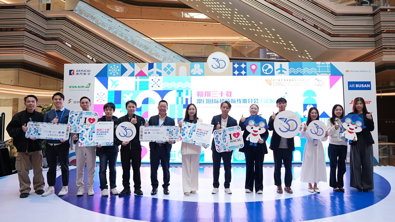 為慶祝澳門國際機場(MIA)營運三十周年,澳門國際機場專營股份有限公司(CAM)於2025年11月29日在深圳卓悅中心舉辦本年度第三場「翱翔三十載」航線推介會及路展活動,並與大灣區市民分享機場營運三十周年的喜悅與發展成果。本次活動特邀多家在澳門國際機場營運國際航線的航空公司及知名旅遊平台代表共同參與,重點推廣前往東南亞及東北亞地區的熱門旅遊航線,吸引更多大灣區旅客經澳門國際機場出行。