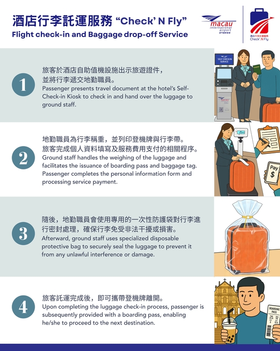 為進一步提升旅客和本地居民出行體驗,澳門國際機場於2026年1月26日起推出「酒店行李託運服務」。旅客和本地居民可於指定的合作酒店內辦理航班值機手續並託運行李,所託運行李將直接送抵最終目的地。此服務省卻攜帶行李往返酒店、景點或前往機場的奔波,讓旅途全程更輕鬆自在。