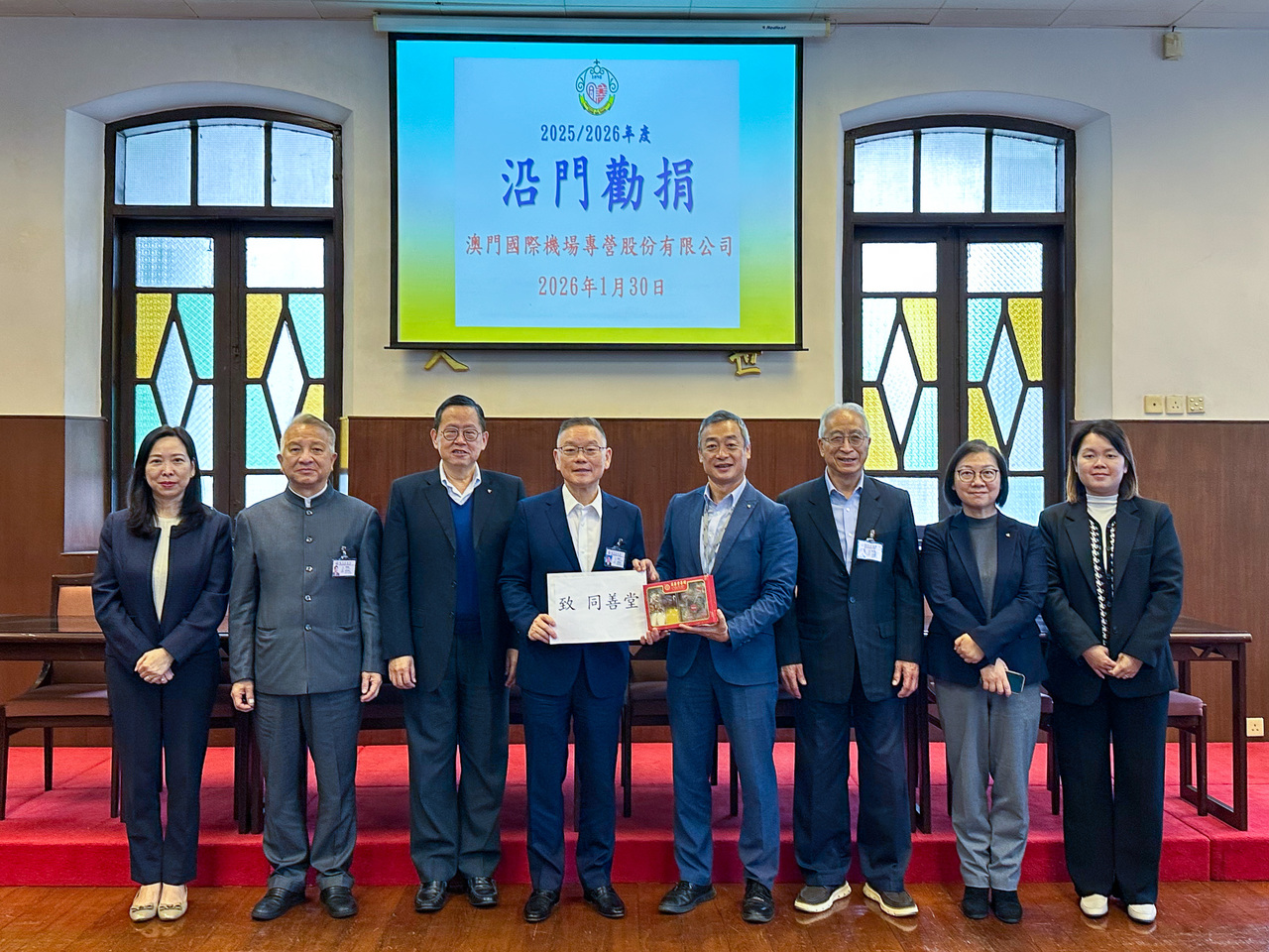 澳門國際機場專營股份有限公司(CAM)執行委員會主席陳穎雄先生、執行董事簡焯坤先生一行於2026年1月30日向澳門同善堂捐款澳門元十萬元響應年度沿門勸捐活動,並由澳門同善堂值理會主席崔世平先生、值理陸永根先生和李傑興先生等代表接收。雙方進行簡短交流和會談,了解雙方最新業務發展,